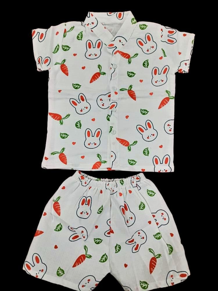 BABY007 – Soft 100% cotton shirt and shorts sets for baby boys. White all-over printed collar shirts with short sleeves and front buttons. Matching elastic-waist shorts for comfort. Pack of 2.