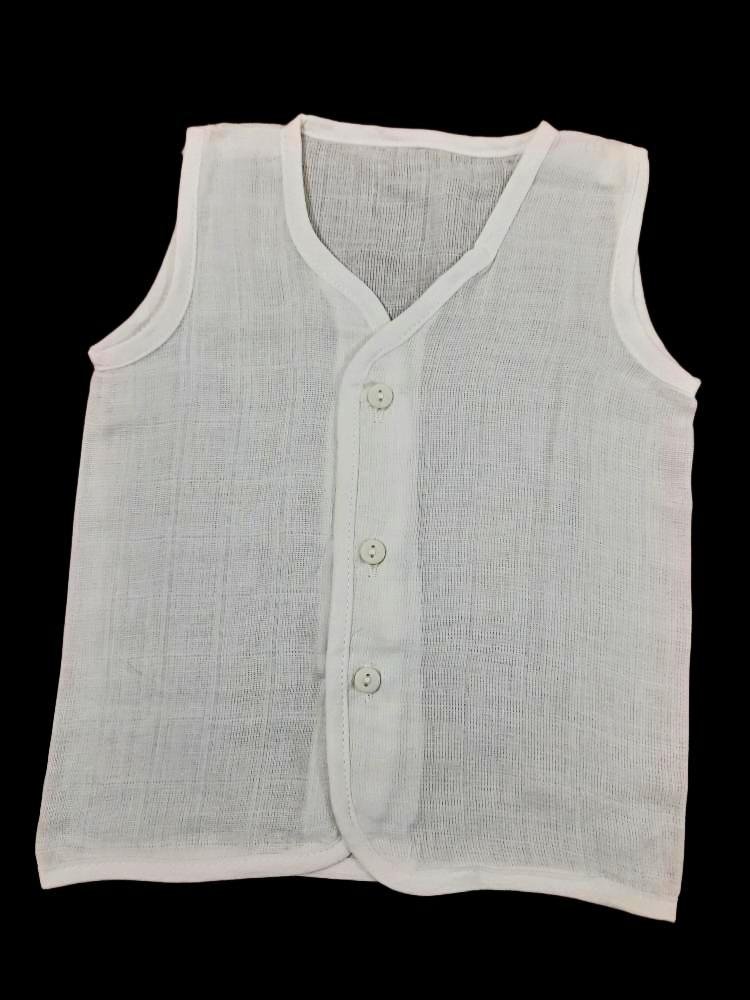 BABY003 – Soft 100% cotton sleeveless tops in classic white. Front button closure for easy dressing. Unisex design, perfect for daily wear. Pack of 5.
