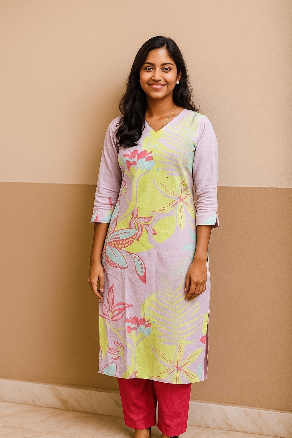 Stay stylish and comfortable with this 100% cotton ladies’ top, crafted with excellent stitching quality and designed for everyday elegance. The V-neckline and 3/4 sleeves add a modern touch, while the side slit opening (22 inches from the bottom) ensures ease of movement and a flattering fit.